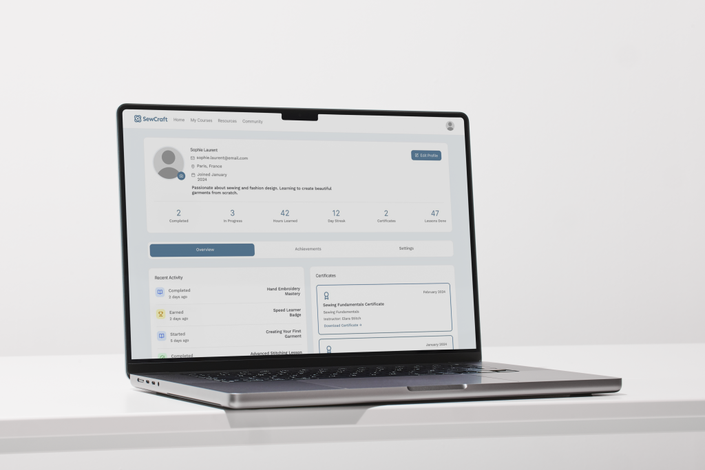 SewCraft a été pensé comme un tableau de bord intuitif permettant aux passionnés de suivre leurs cours, de mesurer leur progression et d’accéder rapidement à leurs ressources créatives.